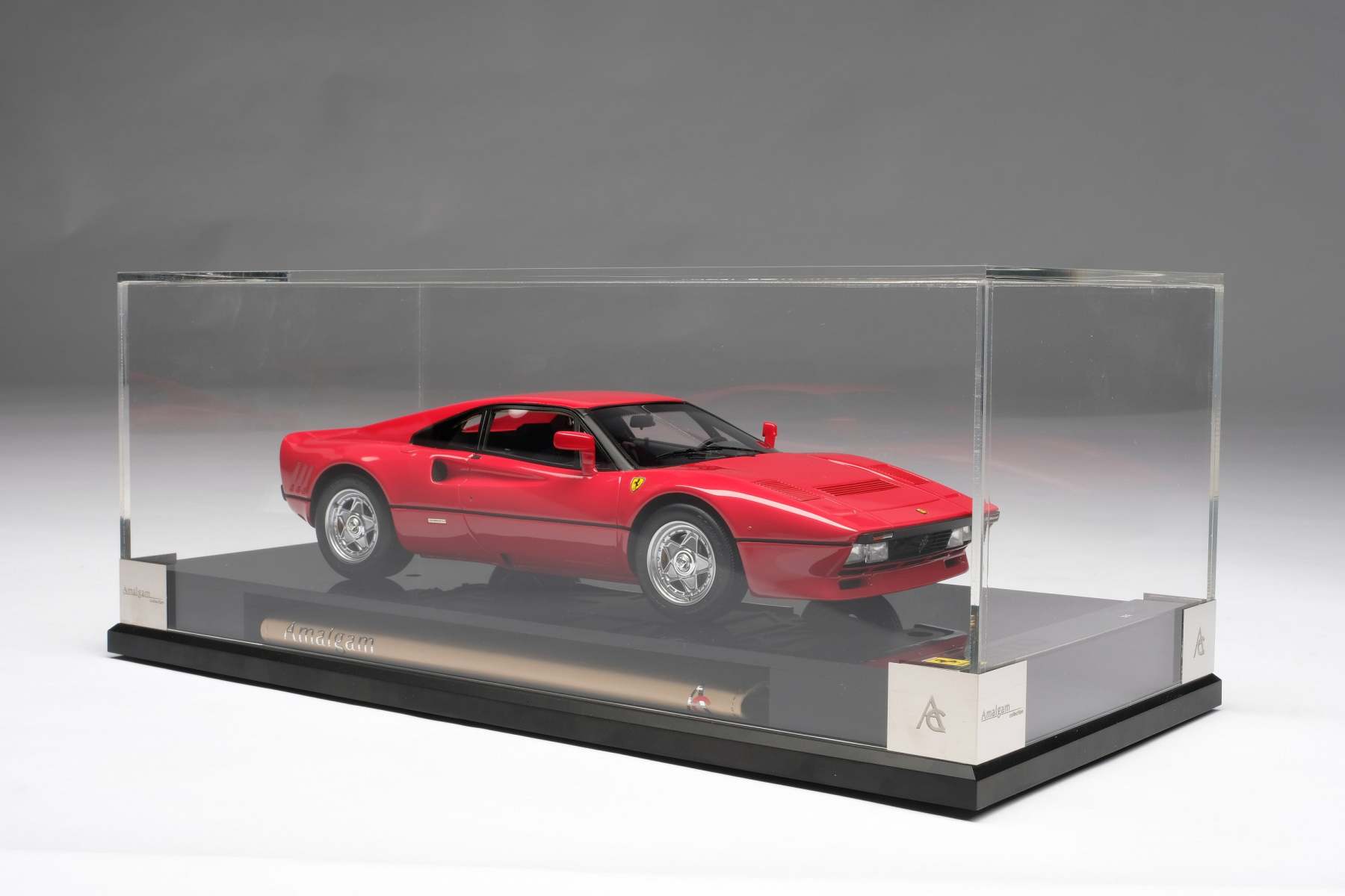 Every Amalgam 1:18 scale model is supplied in a luxury black box with a protective outer carrying sleeve. Each model is mounted on a polished black acrylic base protected by a clear acrylic dust cover. The base holds a booklet containing the certificate of authenticity along with information and collateral material about the car. The model title and original branding is displayed on a polished stainless steel plaque mounted at the front end of the base.