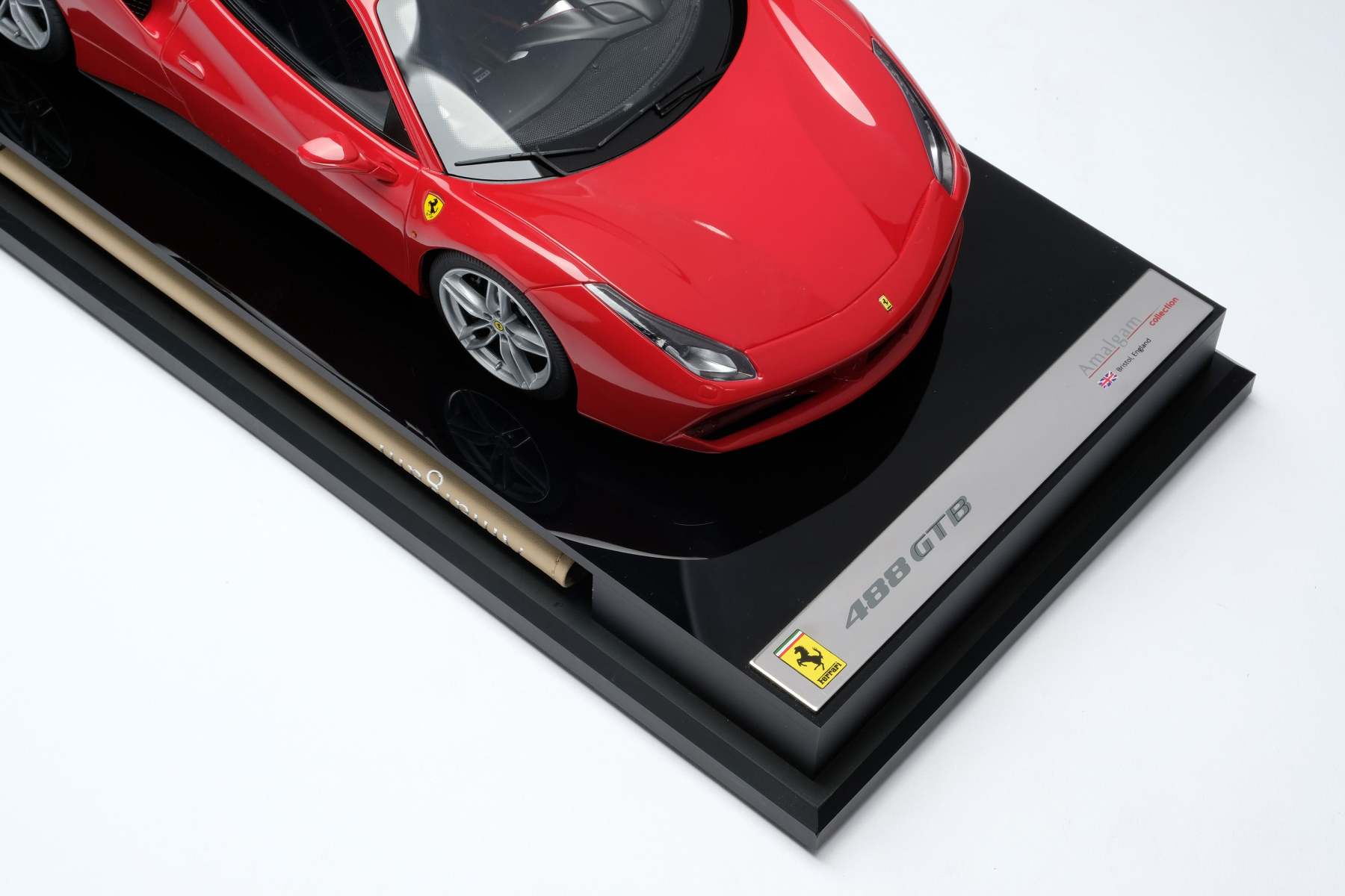 Every Amalgam 1:18 scale model is supplied in a luxury black box with a protective outer carrying sleeve. Each model is mounted on a polished black acrylic base protected by a clear acrylic dust cover. The base holds a booklet containing the certificate of authenticity along with information and collateral material about the car. The model title and original branding is displayed on a polished stainless steel plaque mounted at the front end of the base.