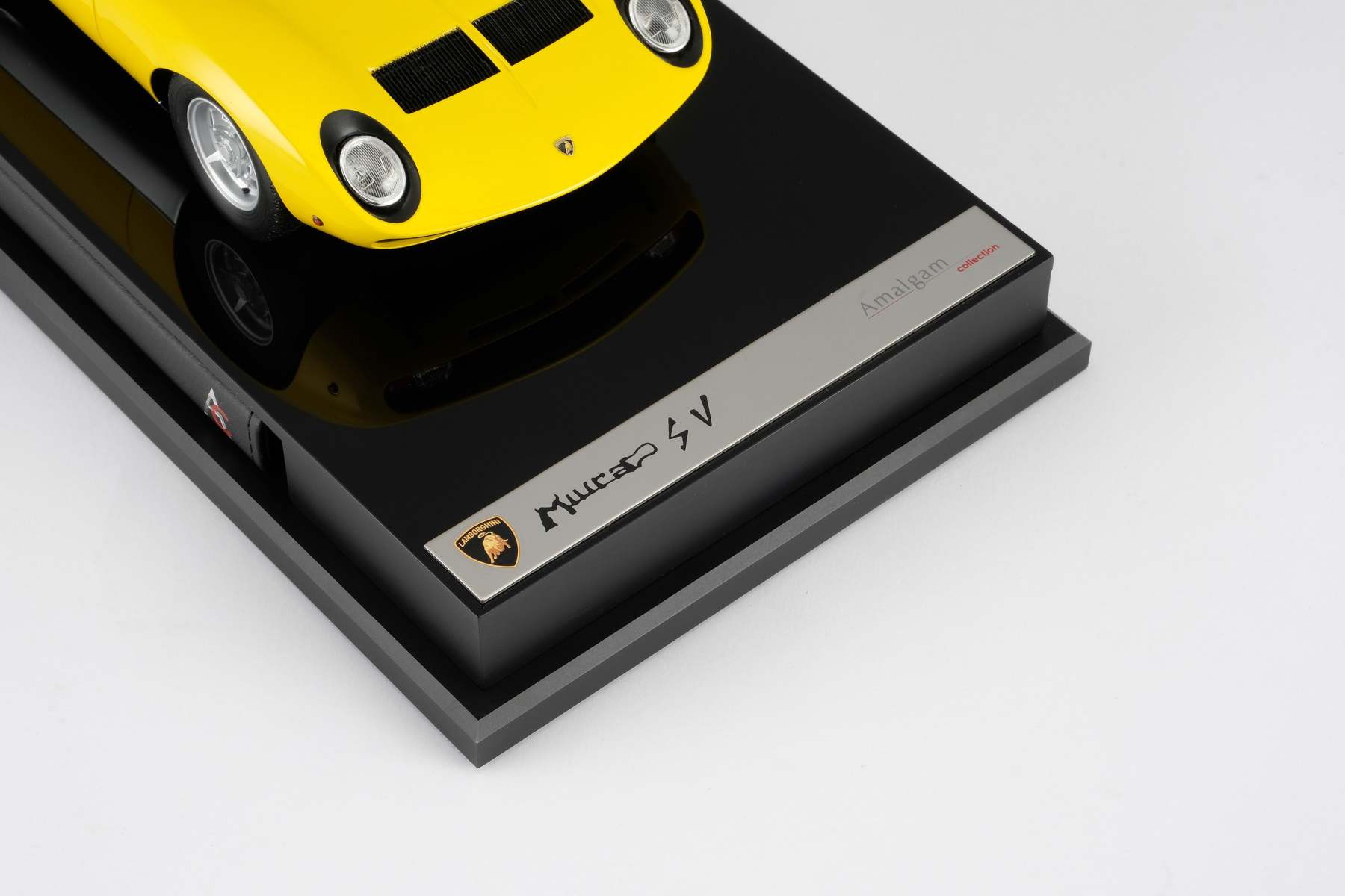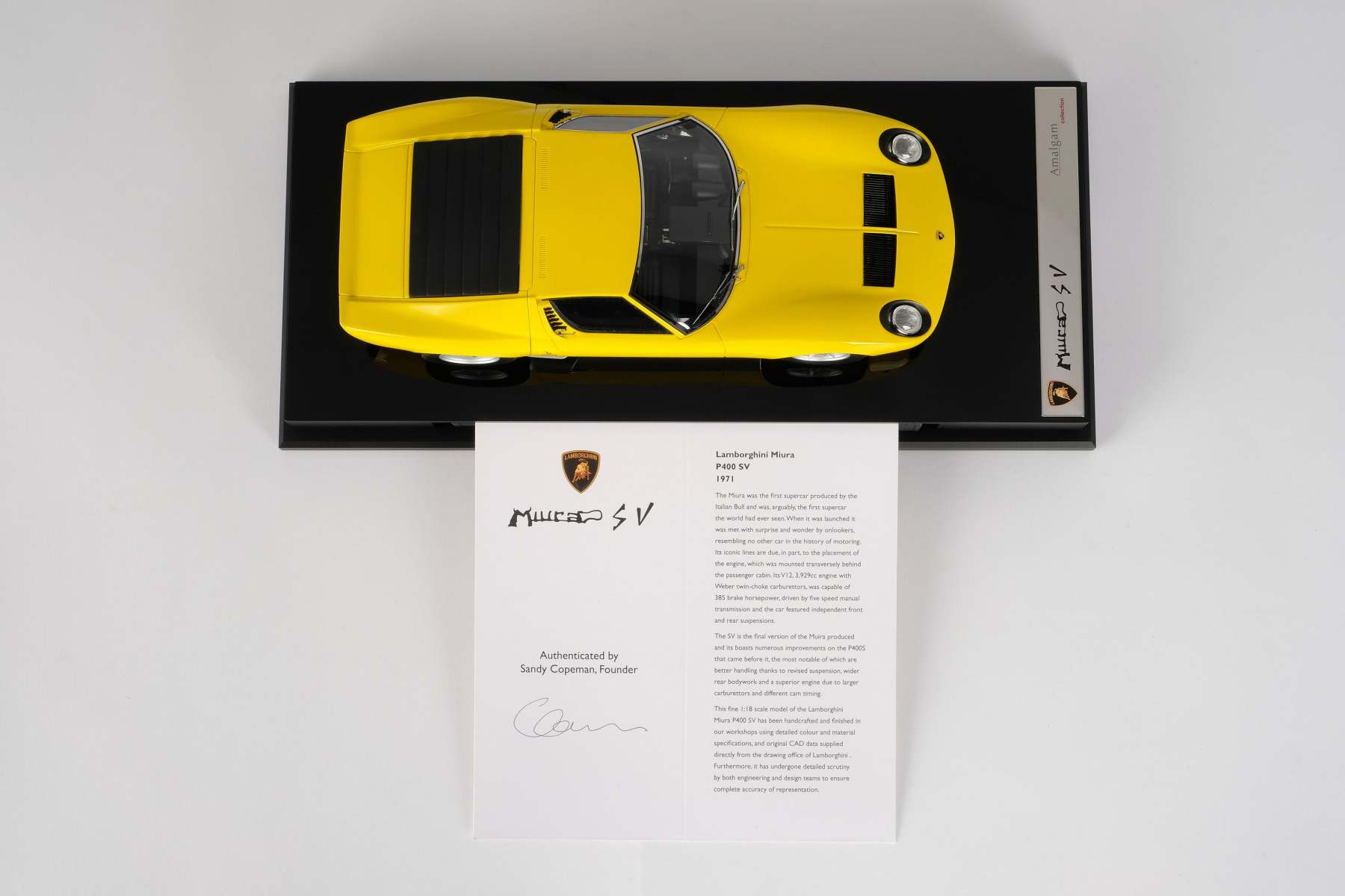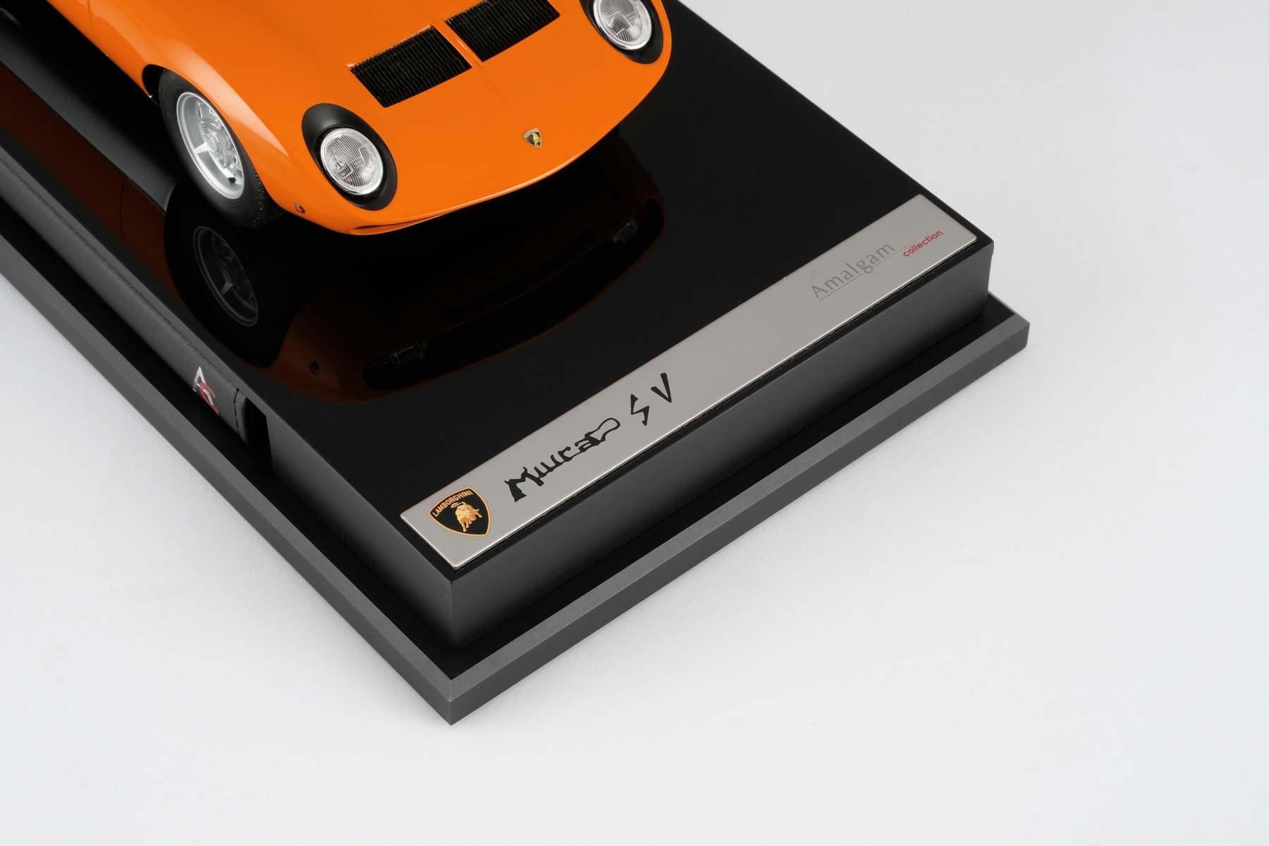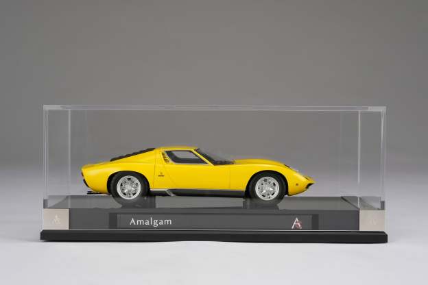 These perfect 1:18 scale models of the Lamborghini Miura P400 SV, available in Giallo, Verde Miura and Arancio Miura exterior paint scheme, have been handcrafted and finished in our workshops with the co-operation and assistance of Lamborghini regarding original finishes, materials, archive imagery and drawings. The use of supremely accurate digital scanning of the original car has allowed us to perfectly recreate every detail at scale. Furthermore, it has undergone detailed scrutiny by both engineering and design teams to ensure complete accuracy of representation. Every Amalgam 1:18 scale model is supplied in a luxury black presentation box and mounted on a carbon fibre or leather base protected by a clear acrylic dust cover. The model title, original branding and edition number are displayed on polished stainless-steel plaques mounted at the front end of the base.